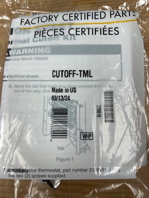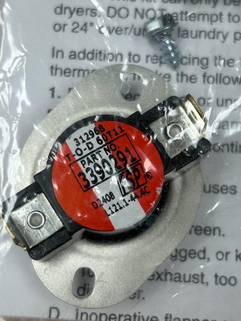 Number Listed on Part: 279816 (Packaging), 3390291 (High Limit Thermostat), 3977393 (Thermal Fuse)