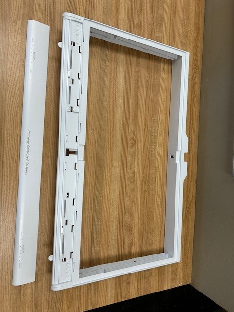 The crisper drawer frame supports the crisper drawer and also holds the shelf that serves as the lid for the crisper drawer. The cover is being sold with the Crisper Cover Trim (P# WPW10231481) and 2 Humidity Control sliders (P# WP67005864).