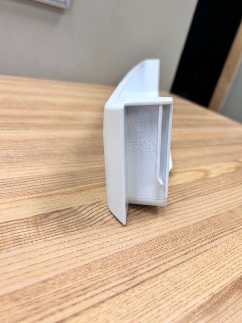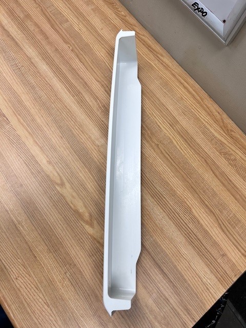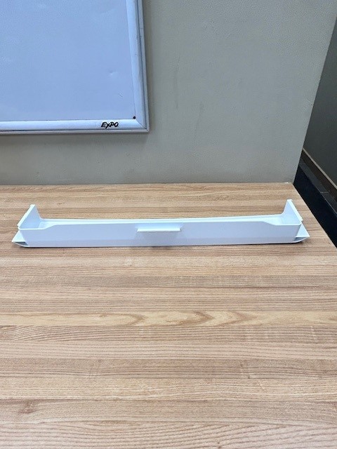 This door shelf bar is white in colour. The door shelf trim snaps into place on the door to hold items on the door shelf. This door bar is normally found at the bottom of the Door in the Fresh food section of a single door 28″ fridge with top mount freezer. Width 23 1/4″