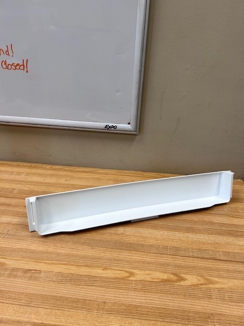Description: This door shelf bar is white in colour. The door shelf trim snaps into place on the door to hold items on the door shelf. This door bar is normally found at the bottom of the Door in the Fresh food section of a single door 28″ fridge with top mount freezer. Width 23 1/4″