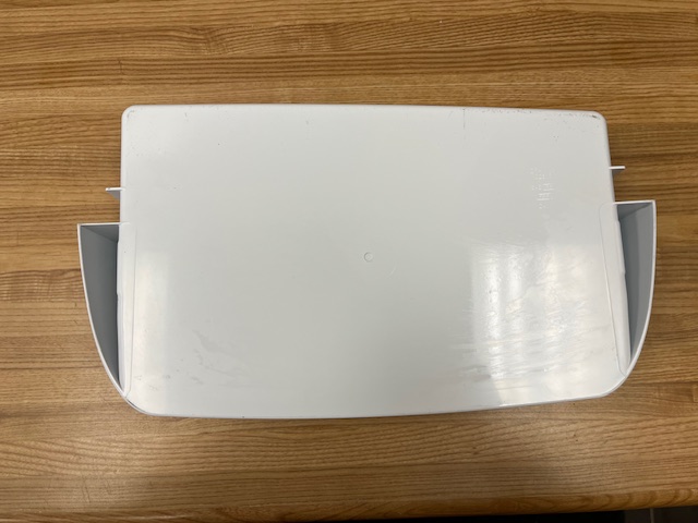This part is white with a plastic clear window at front. The door bin attaches to the inside of the refrigerator door and typically holds jars and bottles. This bin is normally found in a 30″ wide fridge.
