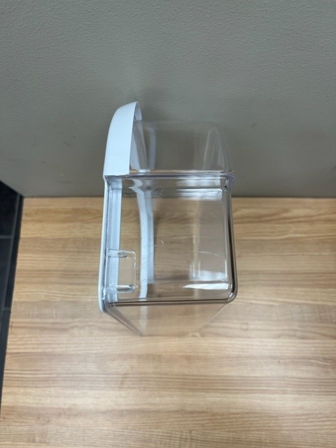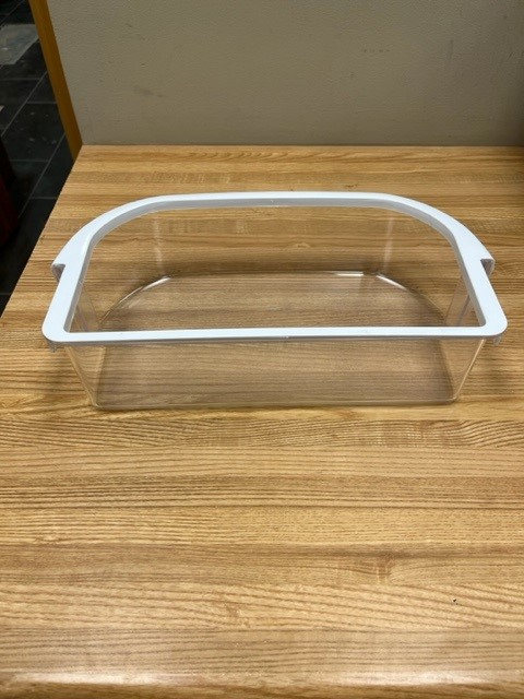 This part is clear with a Full white trim around the top edge. This door shelf bin is approximately 14″ wide x 3-1/2″ high x 7 3/4″ deep. The door bin attaches to the inside of the refrigerator door and typically holds jars and bottles.