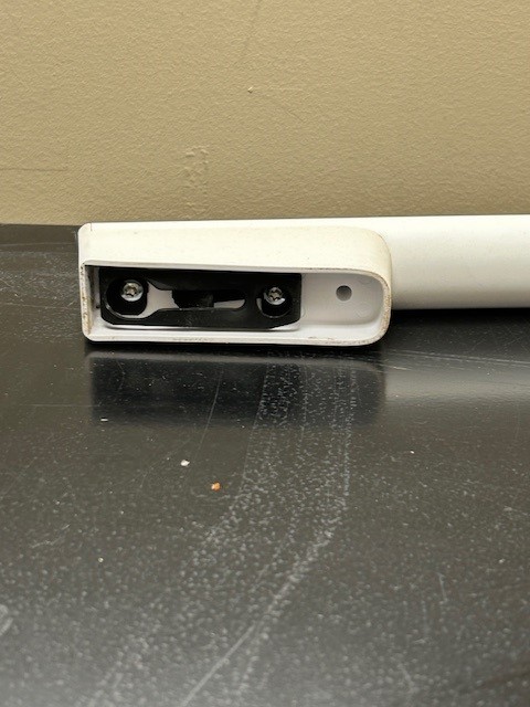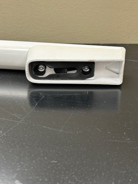 This is a White metal Handle with Plastic End caps. Doesn’t come with the handle screws. Found on a Fridge with a Single Fridge Door and a Bottom Mount freezer.