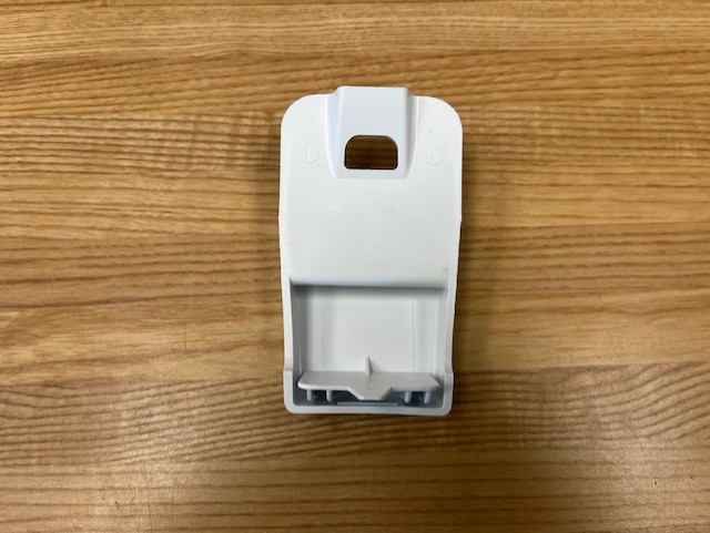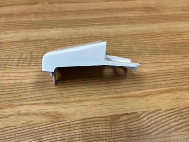 This end cap is white in colour. The door shelf trim snaps into place on the door to hold items on the door shelf.