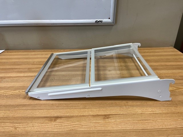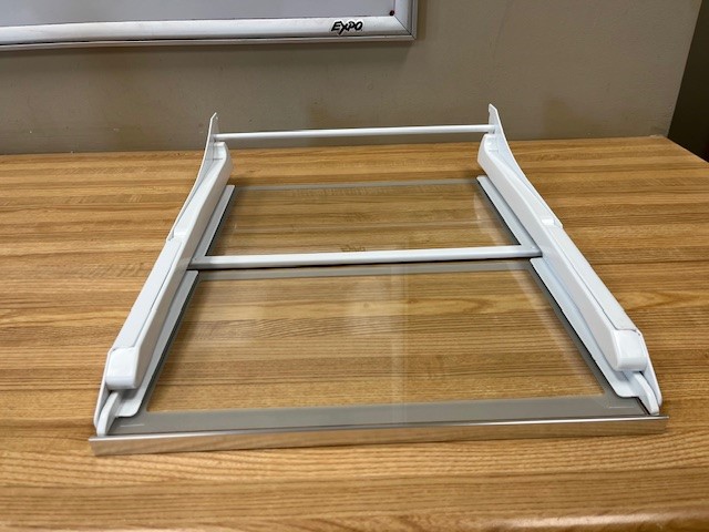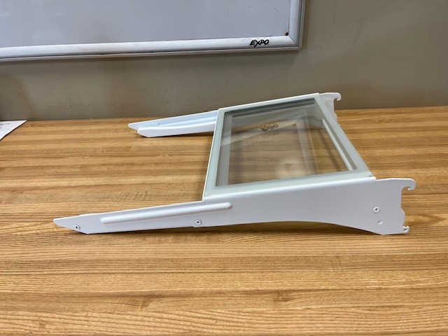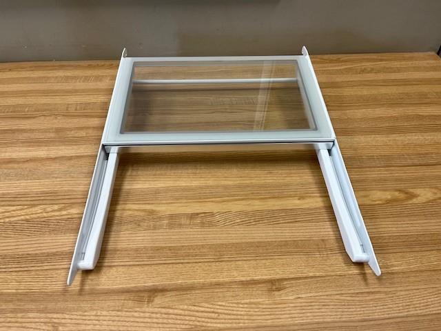 Glass shelf, with white Side supports and a silver trim in the front Shelf placement is adjustable in the Fridge. A portion of the shelf is retractable to allow taller items in the Fridge.