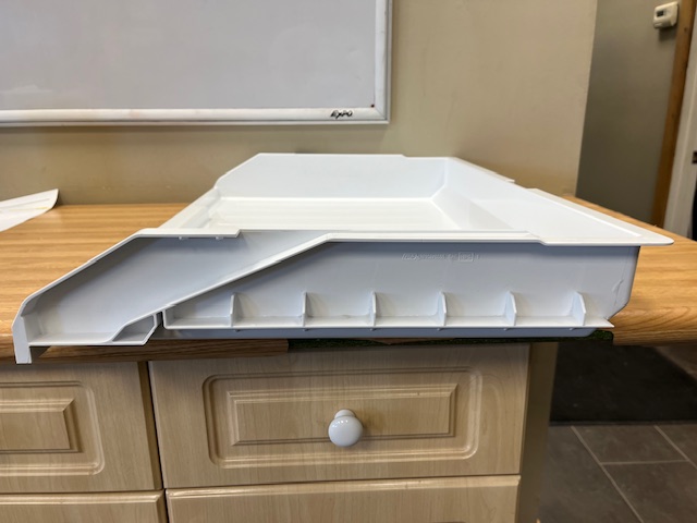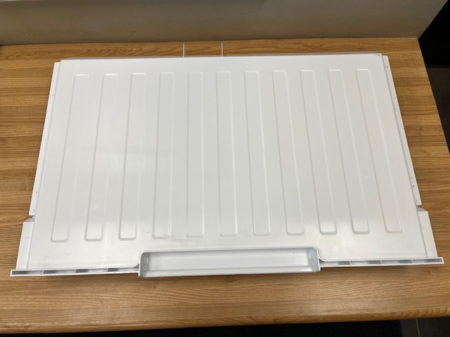 White large pantry Drawer found at the bottom of the fridge section of a French door fridge. Also known as  Large Deli Drawer or Glide N’ Serve Drawer.