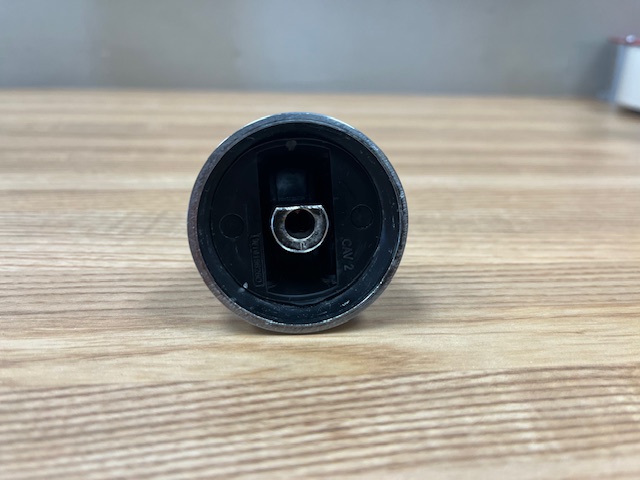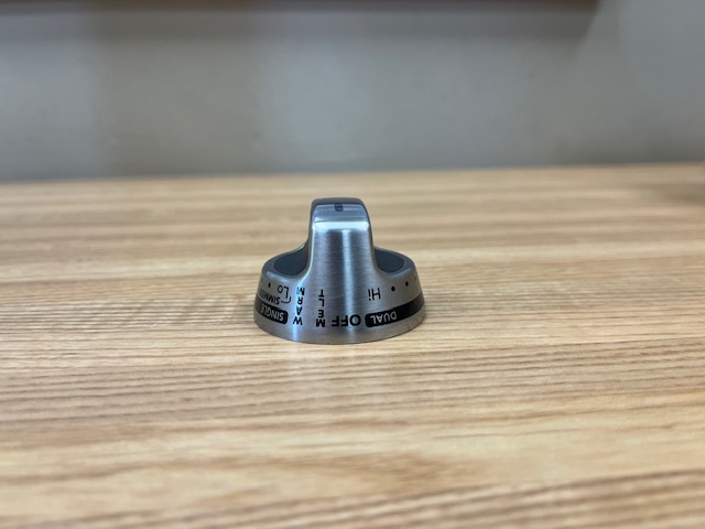 This control knob is stainless in colour with black details. The burner control knob controls the heat of the surface burner on your range.