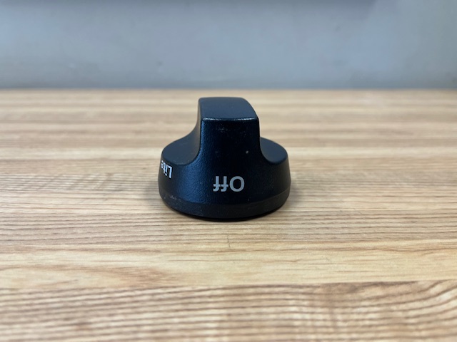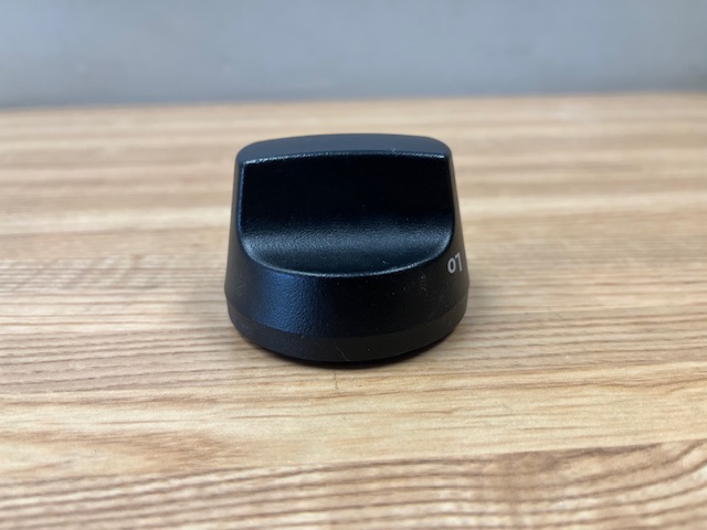 This control knob is metal and black in color. The knob turns the burner control that powers and allows you to control the heat of the surface burner on your range. This is the burner knob for a gas range.