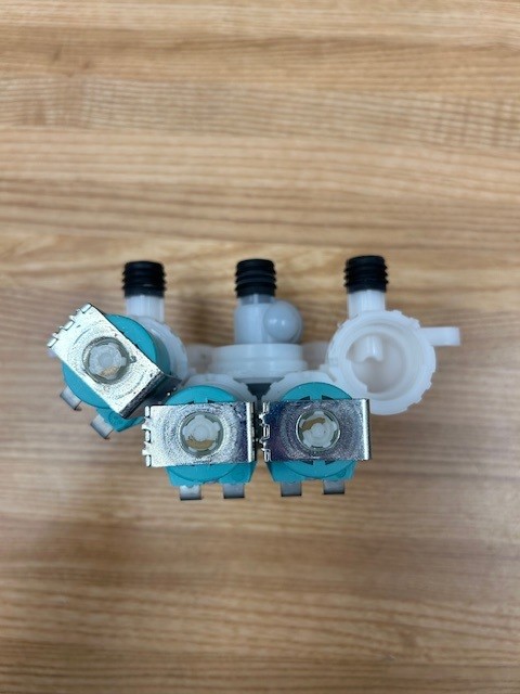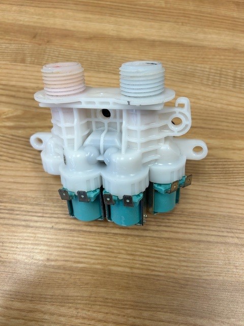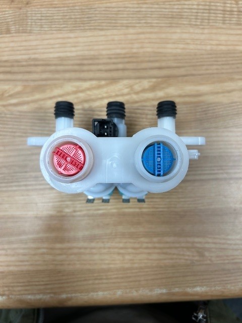 Water inlet valve is usually found in the back of the Washer, and controls the flow of the Hot and Cold water coming into the washer. This particular valve has both the Hot and Cold controls. This Water Valve is found in a Top Load Washer.
